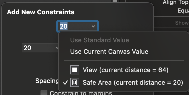 네 방향의 빨간색 선은 노란색 뷰의 상하좌우에 위치한 뷰들간의 관계를 나타낸다. 위 이미지는 노란색 뷰가 위쪽에 존재하는 뷰와 어떤 관계를 가질지 설정하는데, Safe Area 나 최상위 루트뷰인 View와의 관계를 설정할 수 있다. 노란색 뷰가 Safe Area 로부터 20포인트 정도 떨어지는 제약조건을 생성해보자.