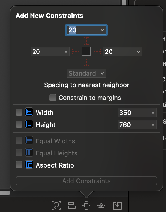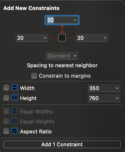 위 빨간색 선이 좀 더 진하게 표시되면, 해당 제약조건을 실제로 추가하겠다는 뜻이다. 마찬가지로 상하좌우에 20포인트만큼의 제약조건을 설정하고, Add 4 Constraint 를 클릭해보자.