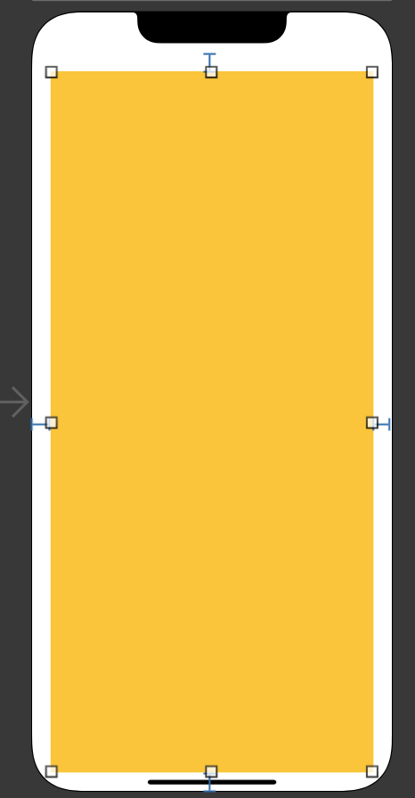 노란색 뷰를 클릭하면, 상하좌우에 파란색 선이 생긴 것을 확인할 수 있다. 위 파란색 선은 제약조건을 나타내는 표시선으로, Safe Area 와 노란색 뷰 간에 어떠한 제약조건을 가지고 있는지를 표시해준다. 20포인트만큼의 제약조건을 줘서, 20포인트만큼의 길이를 가지고 있는 파란색 선을 볼 수 있다.