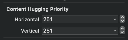 우리는 위 상황에서 Width 에 관해 추측할 수 있는 단서를 주어야 하기 때문에, Horizontal Hugging Priority 를 설정해보자. 값이 높을수록 우선순위가 높아지는데, 우선순위가 높아진다는 뜻은 자기의 본래 크기를 유지한다는 것이다.