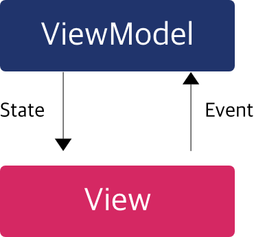 예를 들어 기존 View 기반의 UI 시스템에서 EditText를 생각해보자. EditText는 사용자의 입력에 따라 Event 를 발생시키고, 이것을 ViewModel에 전달한다. ViewModel 은 EditText 이벤트를 기반으로 String value(State) 를 변경시키고, 변경된 State 가 View에 전달된다. 이것을 그림으로 표현하면 다음과 같다.