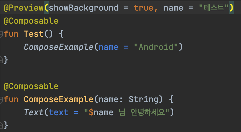 Compose 에선 @Composable 어노테이션이 붙은 함수로 뷰를 구성할 수 있다. Composable 함수는 매개변수를 받을 수 있는데, 이로 인해 외부에서 데이터를 받아서 그 데이터를 사용자에게 보여줄 수 있다.