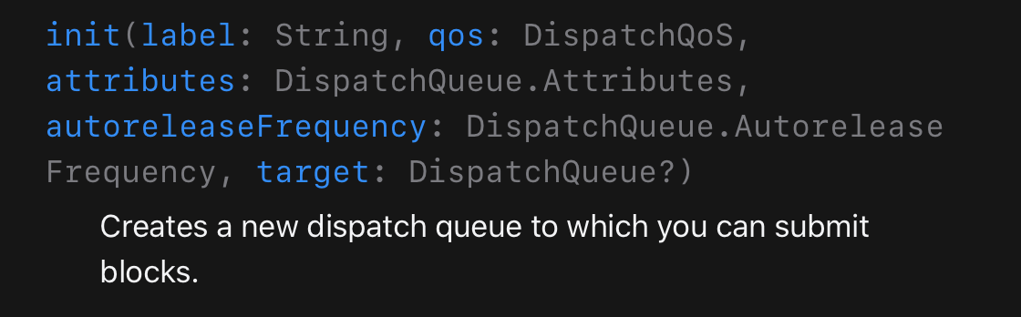 시스템에 이미 정의된 global, main DispatchQueue 말고도 나만의 DispatchQueue 를 생성할 수 있다. DispatchQueue 의 생성자를 보자