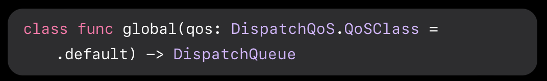 qos (Quality Of Service) 클래스를 삽입해서 DispatchQueue 를 생성할 수 있다. 여기서 qos 는 기본적으로 default 클래스를 매개변수로 받으므로, DispatchQueue.global() 함수는 default 우선 순위를 가지는 DispatchQueue 를 반환한다고 할 수 있다.