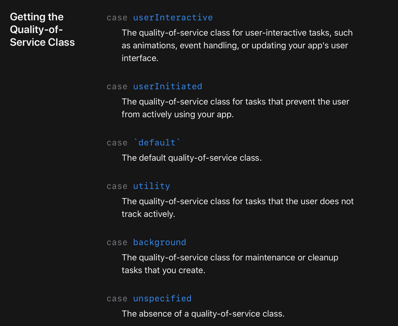 qos 는 위와 같은 목록이 있으며, 우선순위가 내림차순으로 정렬되있다. userInteractive 케이스의 경우 가장 높은 우선순위를 가지고 있으며, 다른 어떤 우선순위를 가진 작업보다 우선적으로 실행된다. background 케이스의 경우 가장 낮은 우선순위를 가지고 있으며, 당연히 스케줄링에서 뒤로 밀리게 된다.